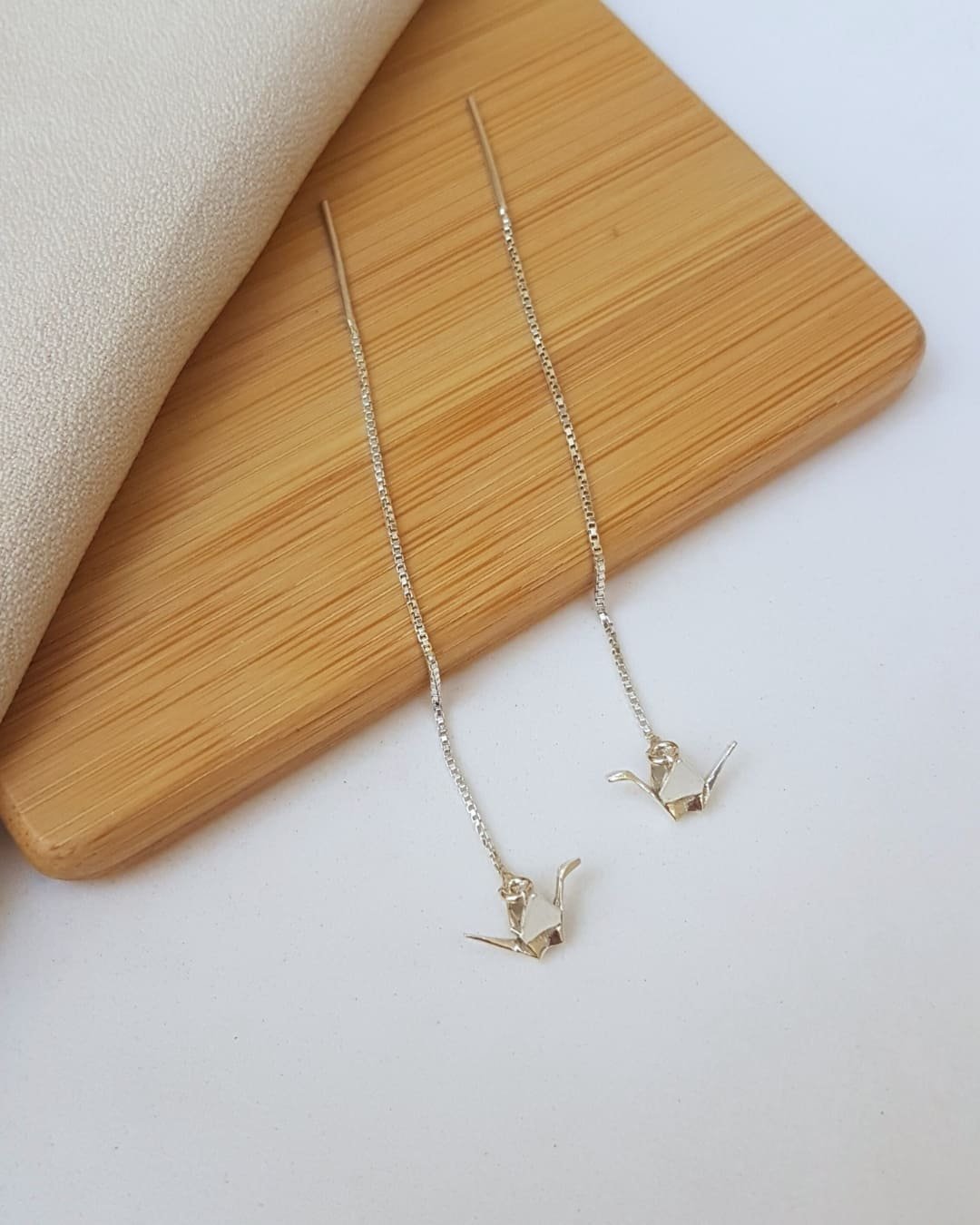 Inspirado na beleza da arte do origami, o Brinco Pássaro Tsuru Fio Passante da Djuna Joias é feito em prata legítima 925 e carrega toda a simbologia do tsuru — longevidade, prosperidade, felicidade e saúde.