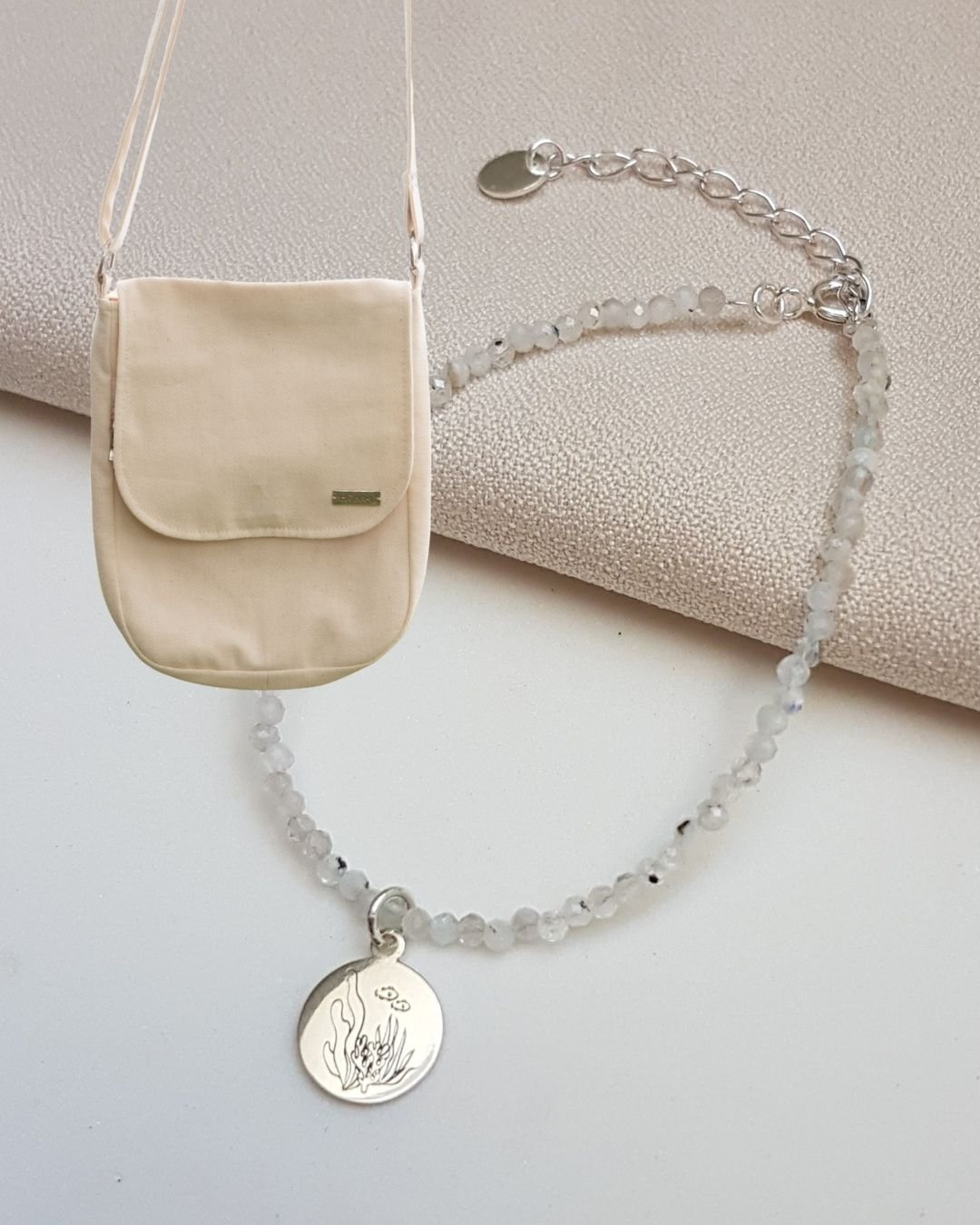 O que vai no kit: 1 bolsa lateral cru lisa design exclusivo Hokkai Store e 1 pulseira de pedras naturais lapidadas Pedra da Lua 2mm com medalha Be true, Be free com estampa Hokkai Store.